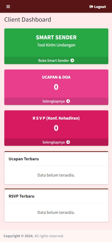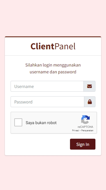 Login pada client panel menggunakan username dan password yang sudah diberikan admin via Whatsapp saat pemesanan undangan.